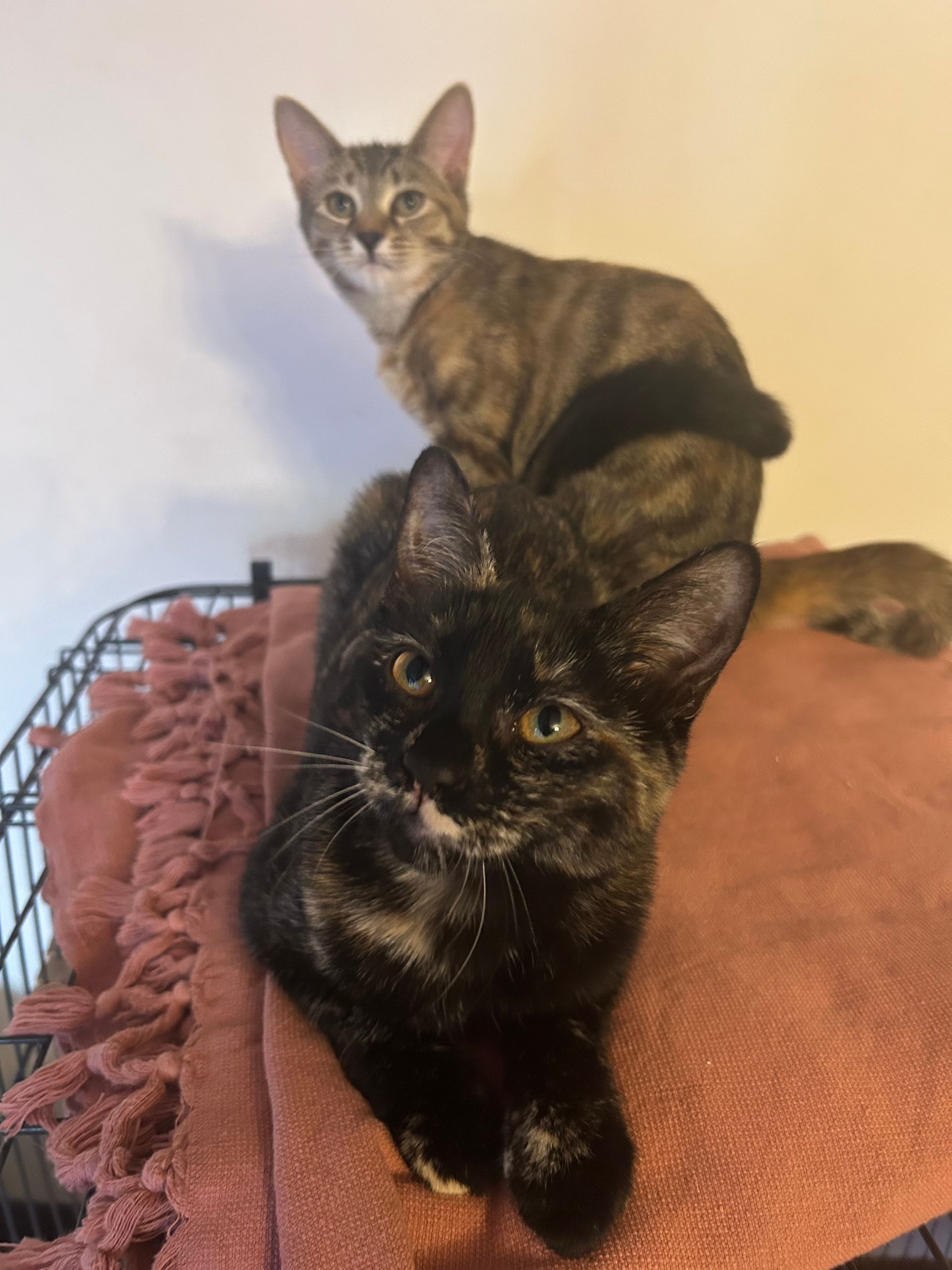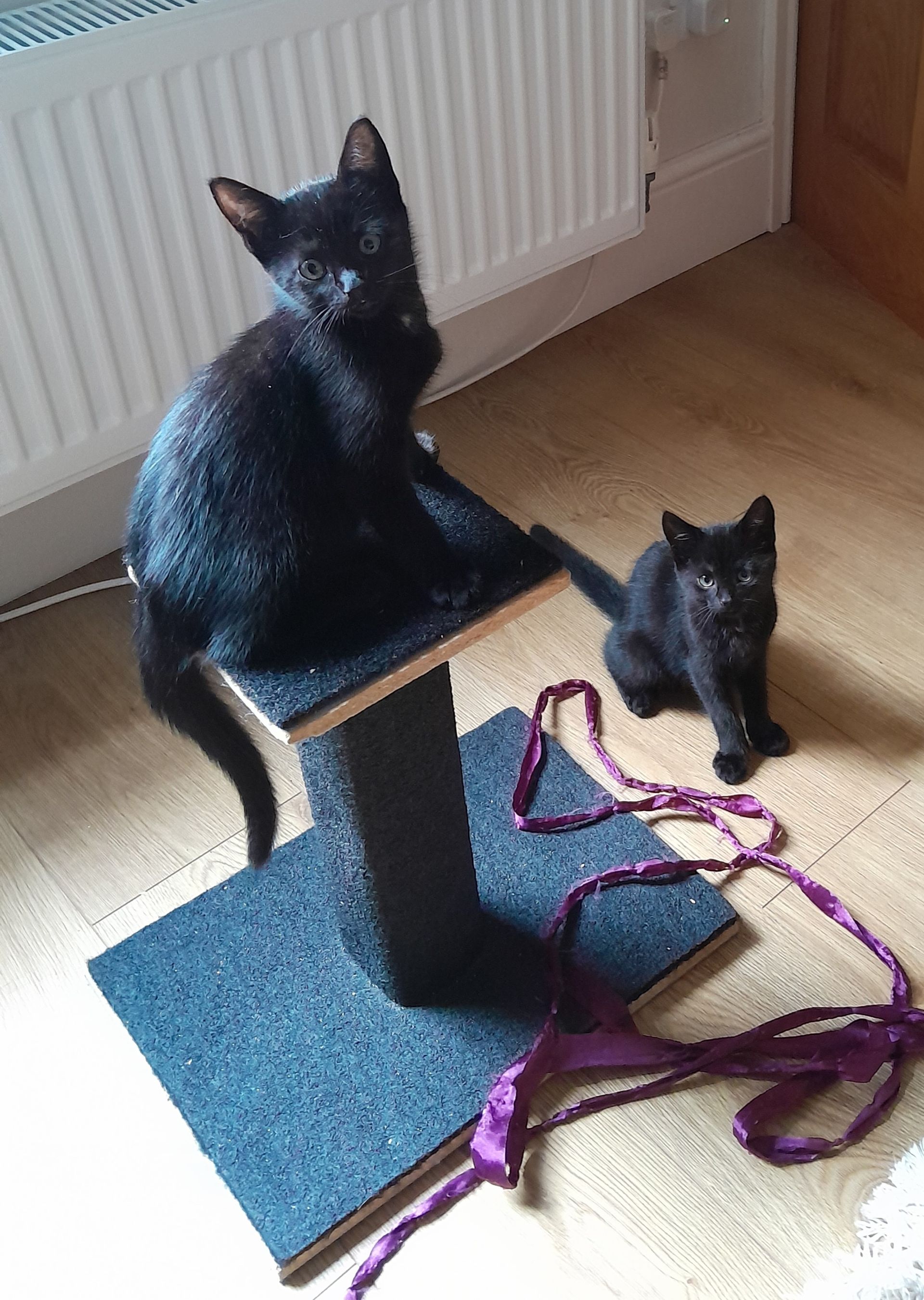 Athena and Mars (both female) are now 10-11 weeks old, friendly, playful and brave and both love a good snuggle. The vet did not detect any health conditions, they have been fleaed and wormed, and have had their first vaccinations (2nd due at 12 weeks). They are not due to be spayed just yet.