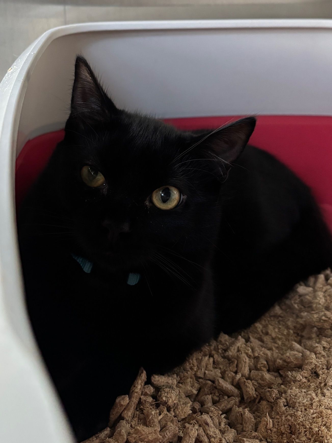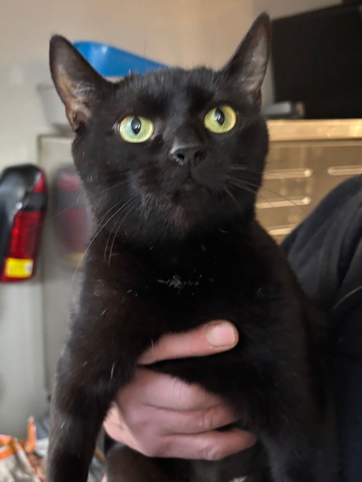 Tess is an all black dainty girl aged 10-12 months. She was found as a pregnant stray and we are rehoming her kittens in time. She's super-friendly to humans but needs a home where there are no other cats or dogs. She loves kids.